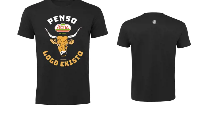 En concreto, Biona forma parte del diseño de una de las tres camisetas de la nueva colección ‘Roupa de Marca’. En ella, se hace un divertido juego de palabras con la frase “Penso, logo existo” (“Pienso, luego existo”) junto con la enseña de la firma y el dibujo del busto de una vaca de raza cachena.